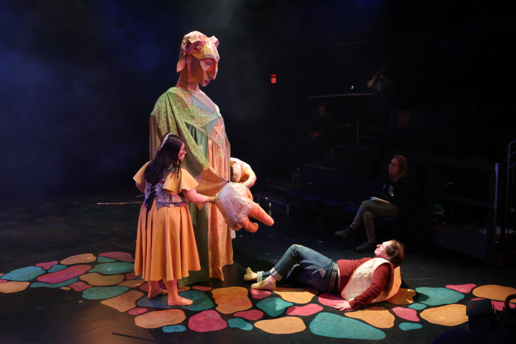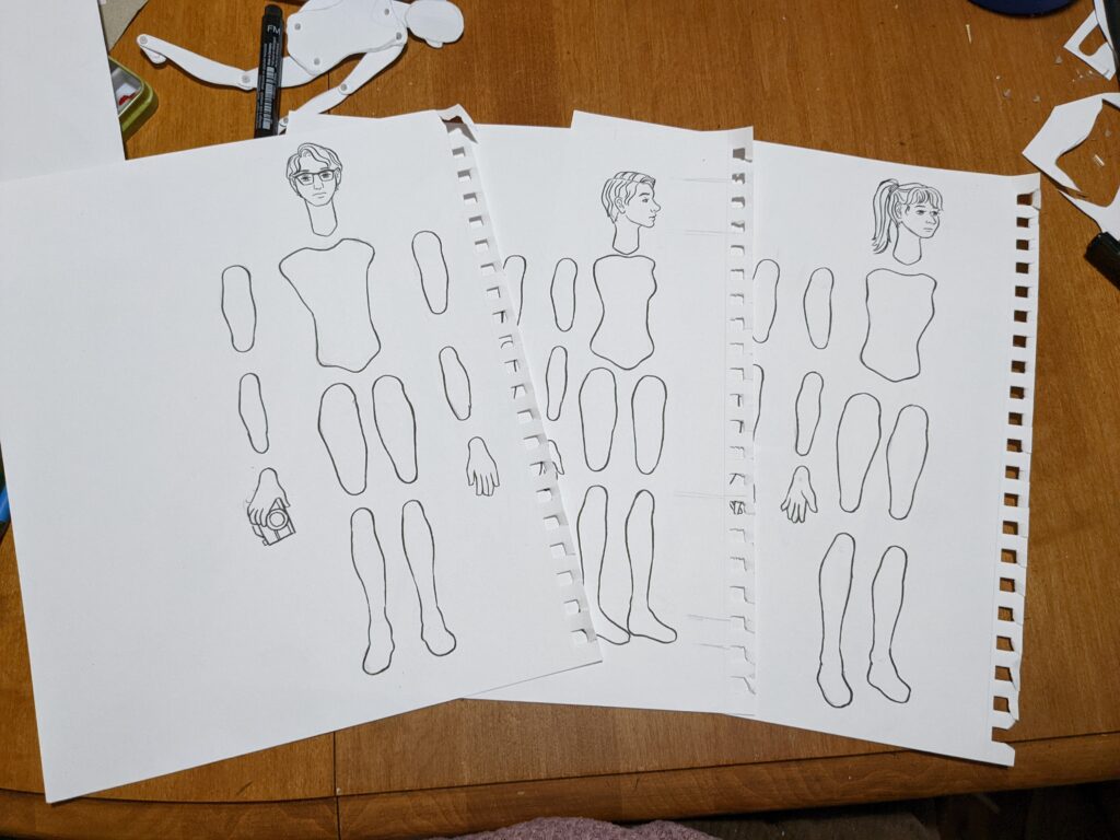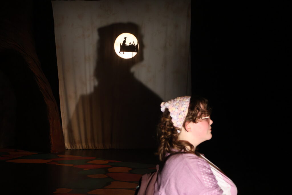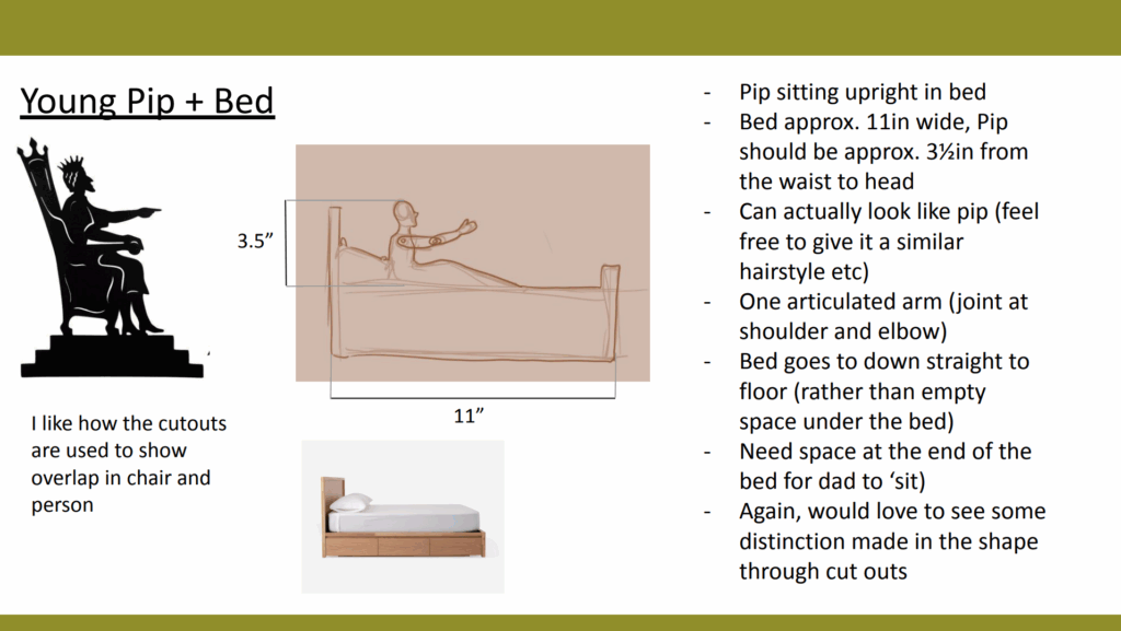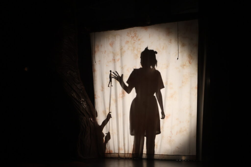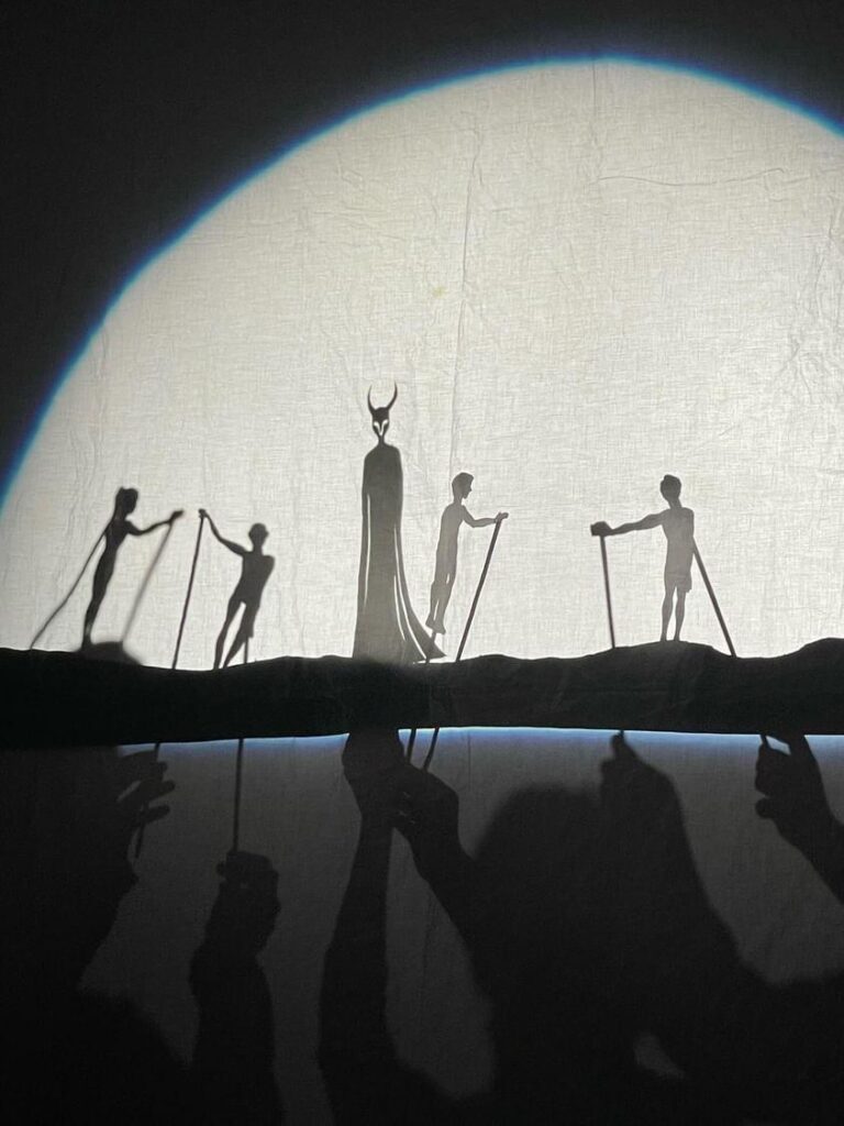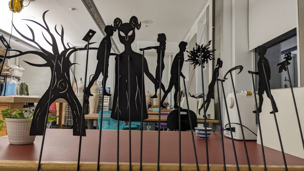 As the puppet designer I oversaw a team in the creation of shadow puppets for the same show. I created detailed documentation to help guide the crew through the process. Below you can see some of the preliminary experiments, one of my design slides, and the final puppets.