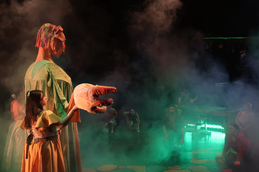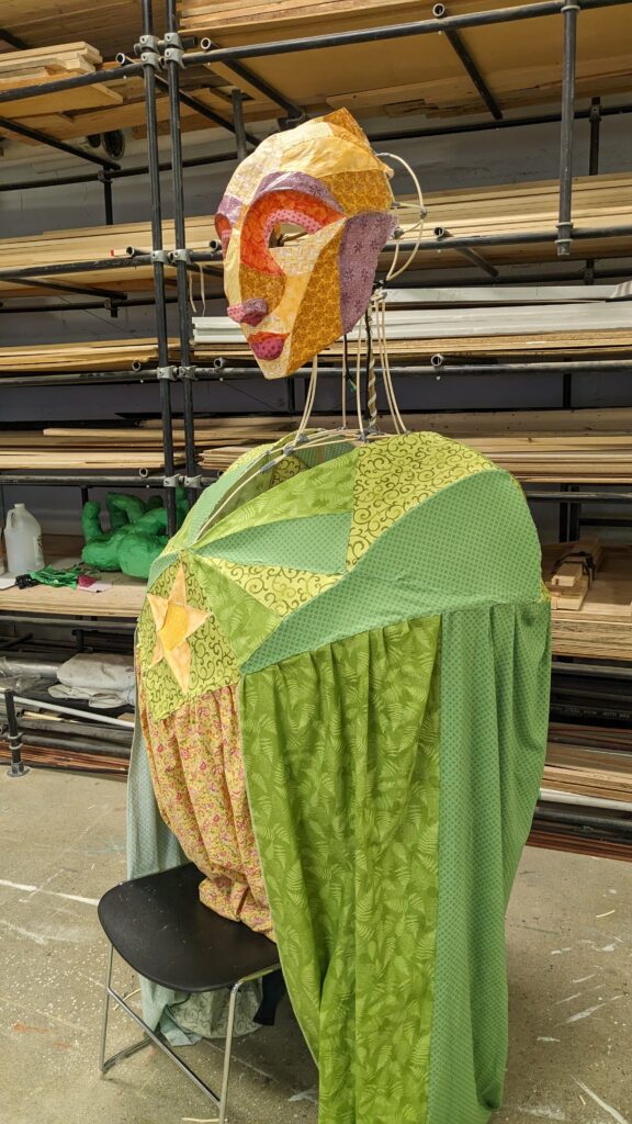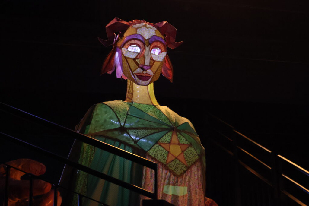 I designed and created this puppet for the production of an orginal story developed by the Patchwork Production collective. Standing at just over nine feet tall, this puppet was made from bamboo, reed, and fabric. Built as a three person backpack puppet one person carried the boy and controlled the head while two more puppeteers opperated the arms on either side. Featured a turning head and internal lights this puppet was a central point of the show.