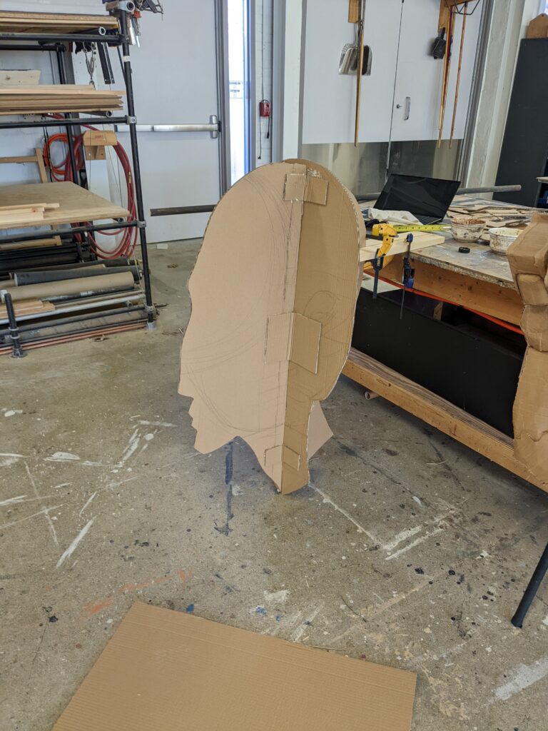 Created for the premere show of the Patchwork Production collective this giant head was made entirely of cardboard. The hands seen in the final picture were created for a pervious show by another designer.