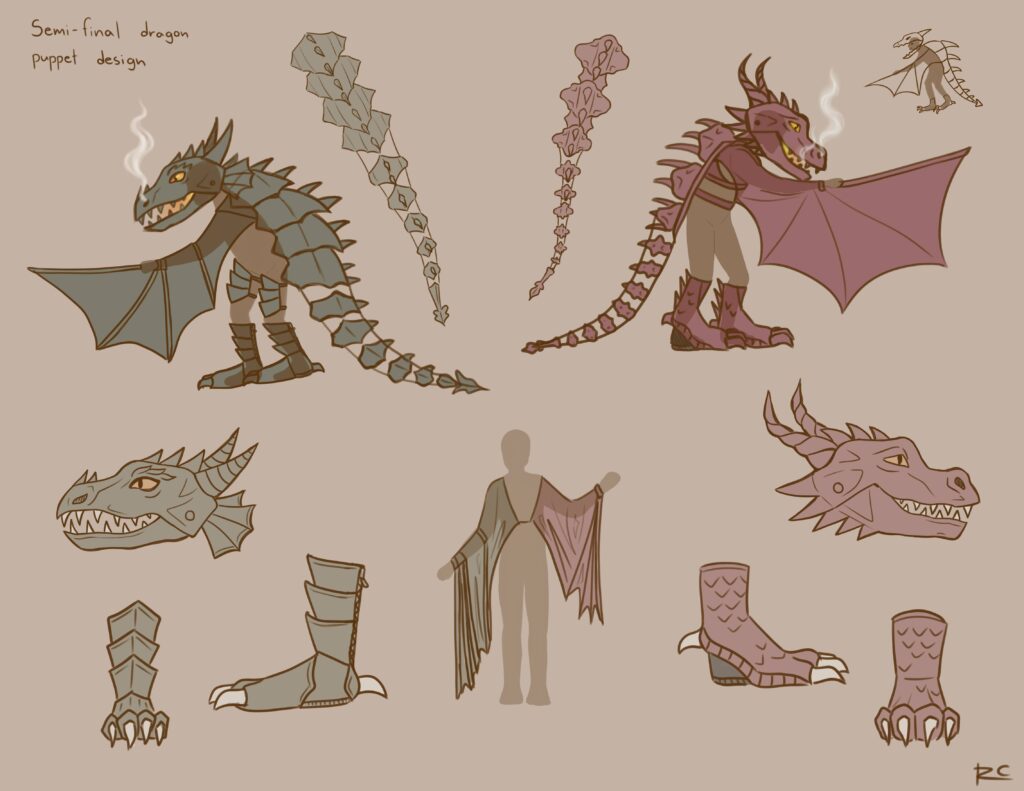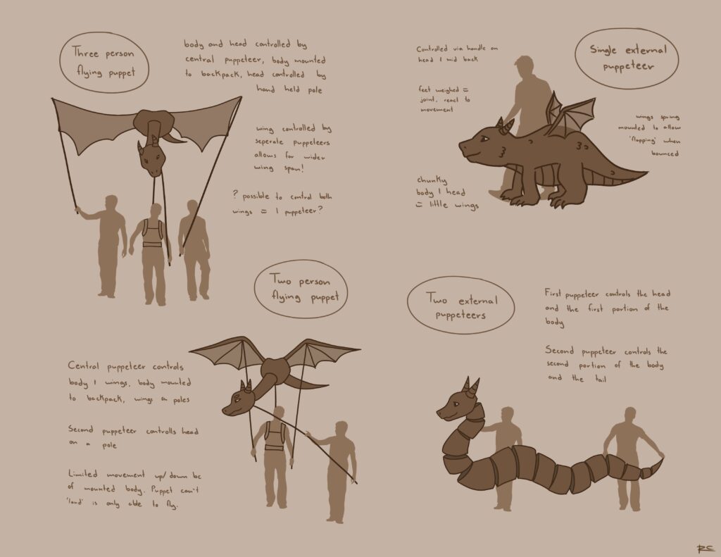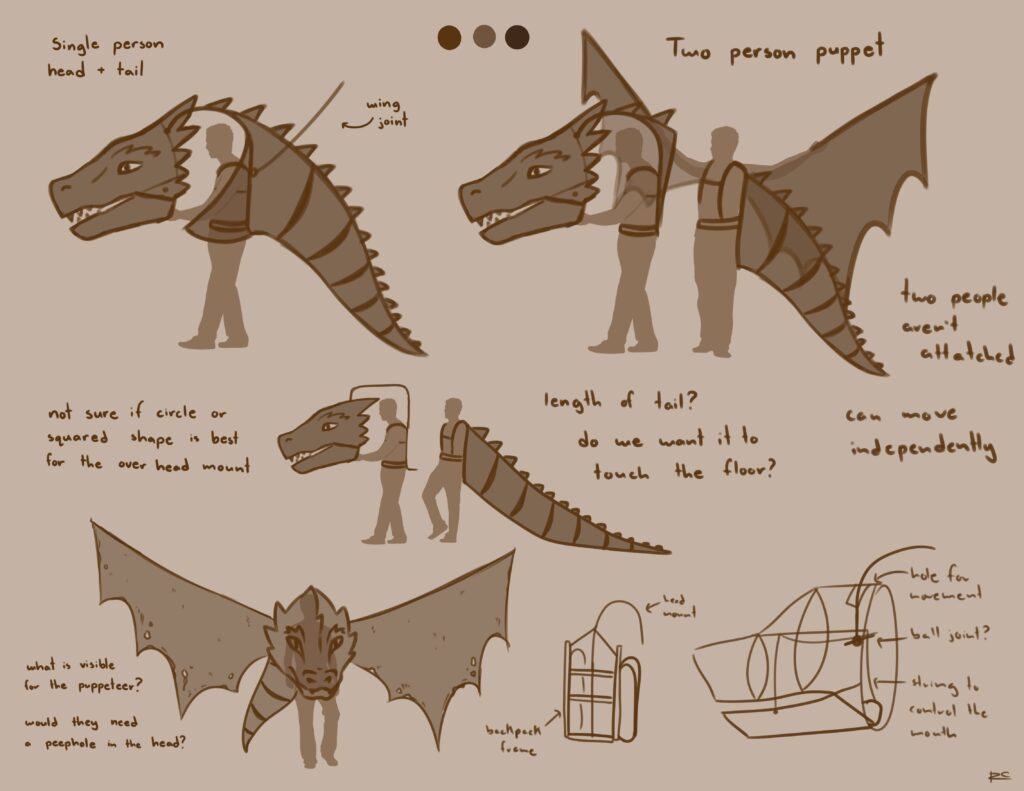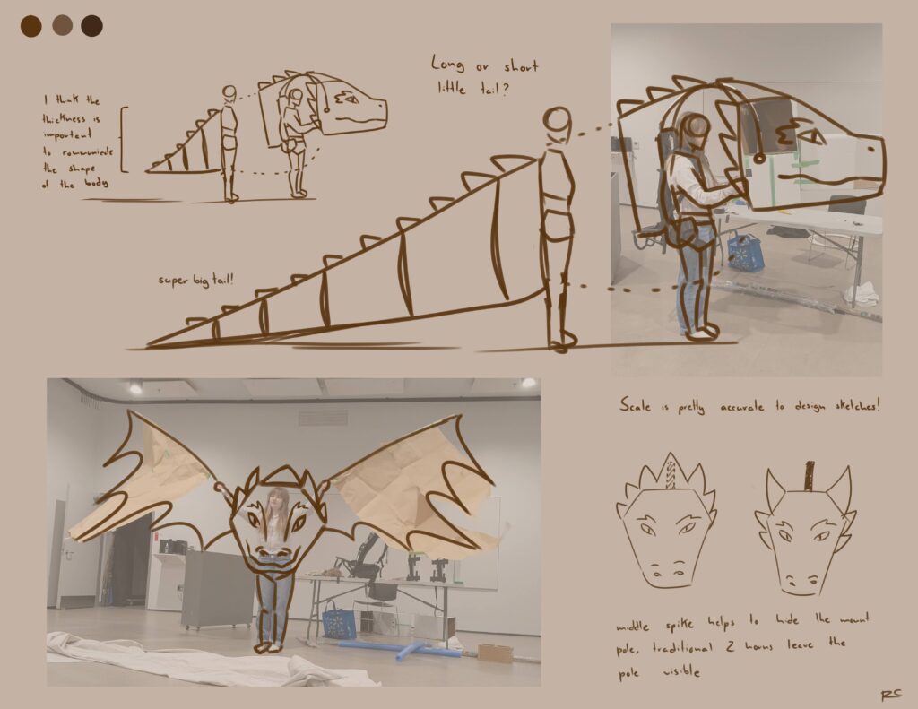 I recently had the chance to work on the development of a giant dragon puppet design. Working alongside the director I was invovled in designing, experimentation, and preliminary building.