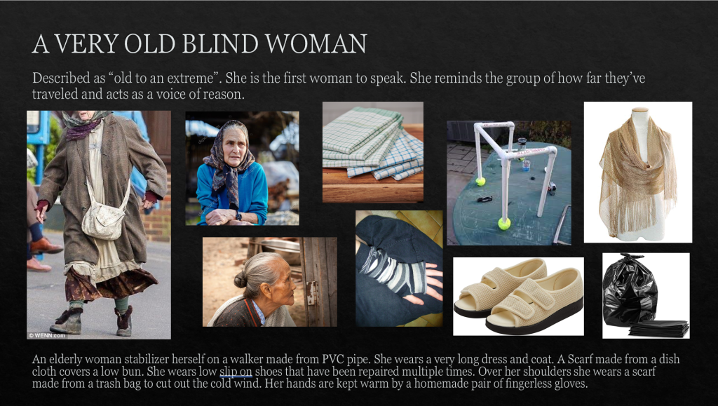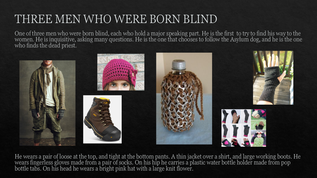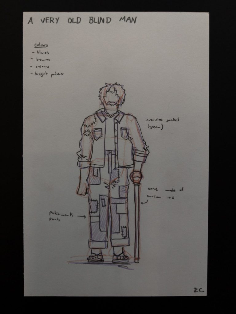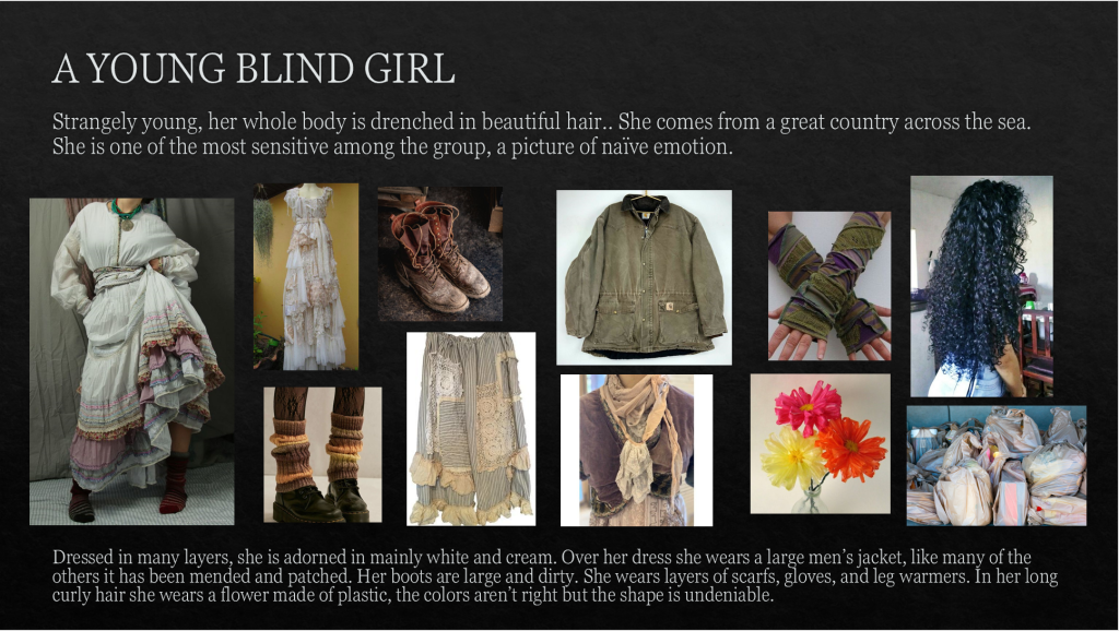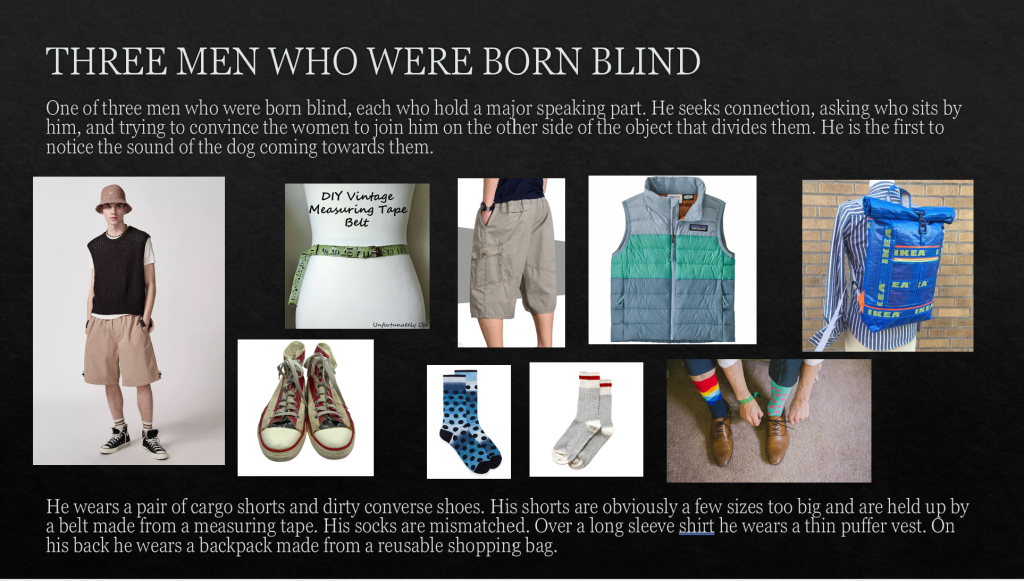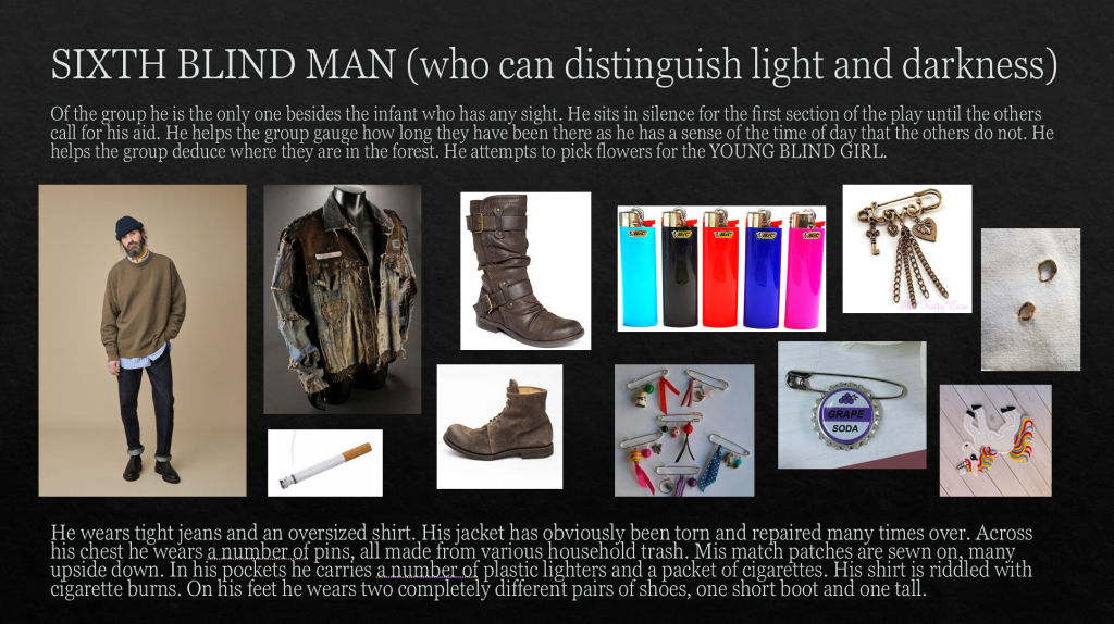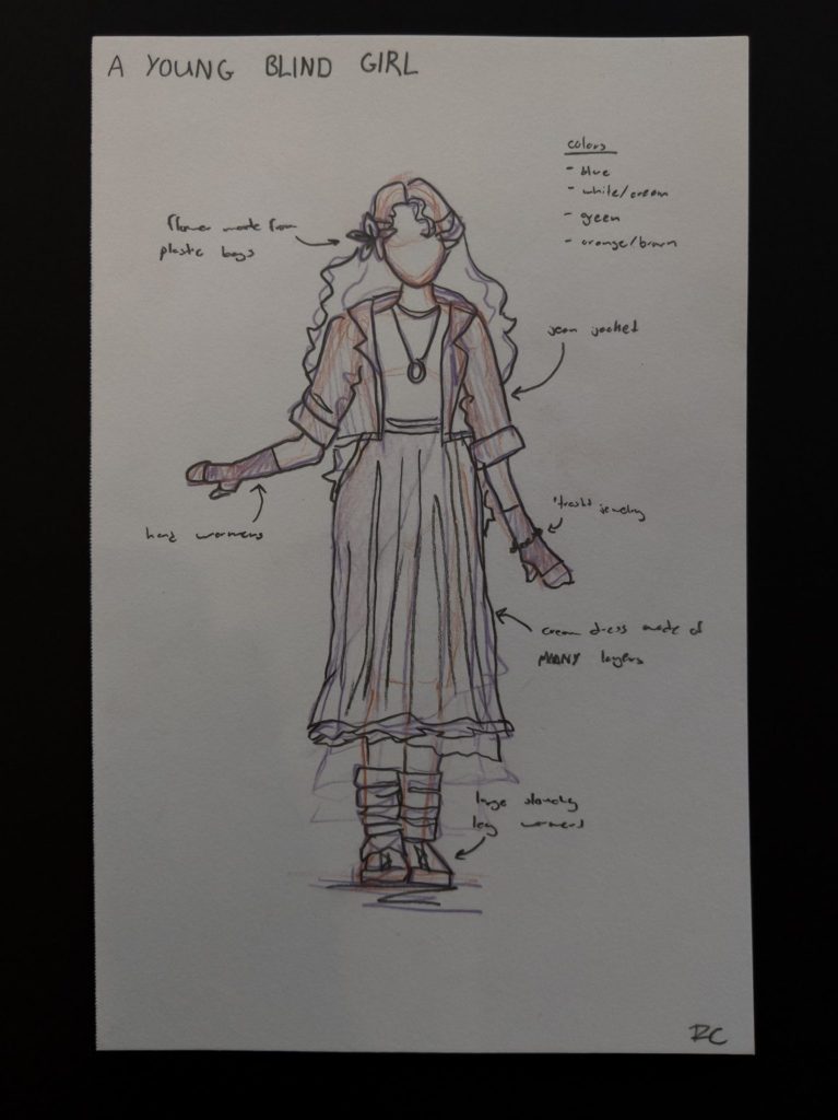 Below is a series of proposed costume designs for Les Aveugles by Maurice Maeterlinck. Les Aveugles tells the story of a group of blind asylum patients who are left abandoned in the woods after the priest who was guiding them suddenly disappears. Inspired by the idea that many of us are ‘blind’ to the current climate crisis, I chose to set my interpretation of the play in a possible future, where society has collapsed due to extreme pollution.