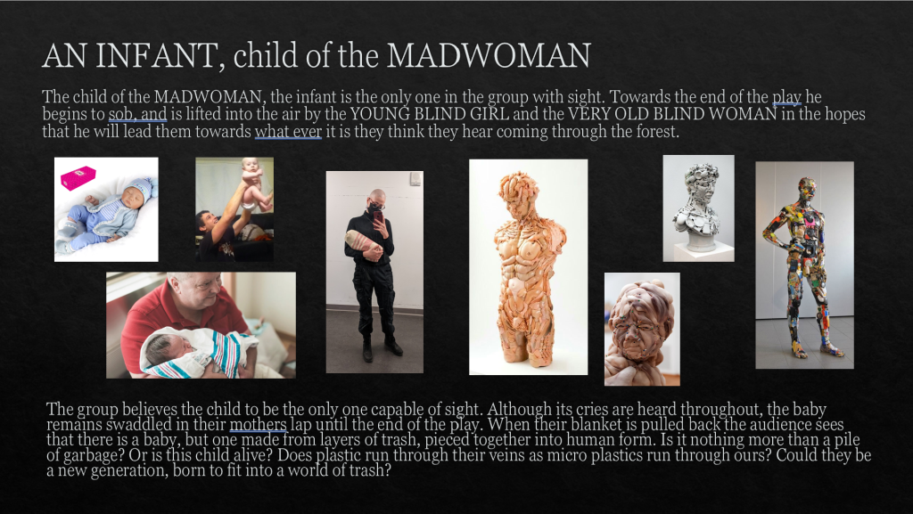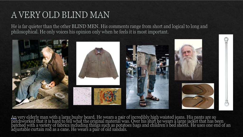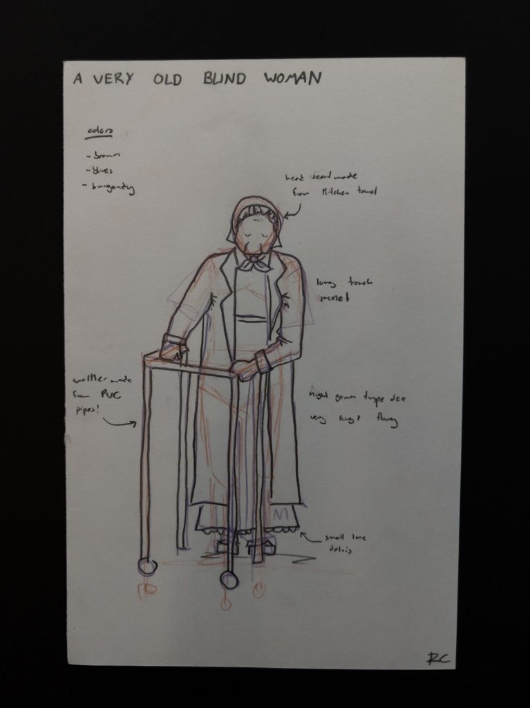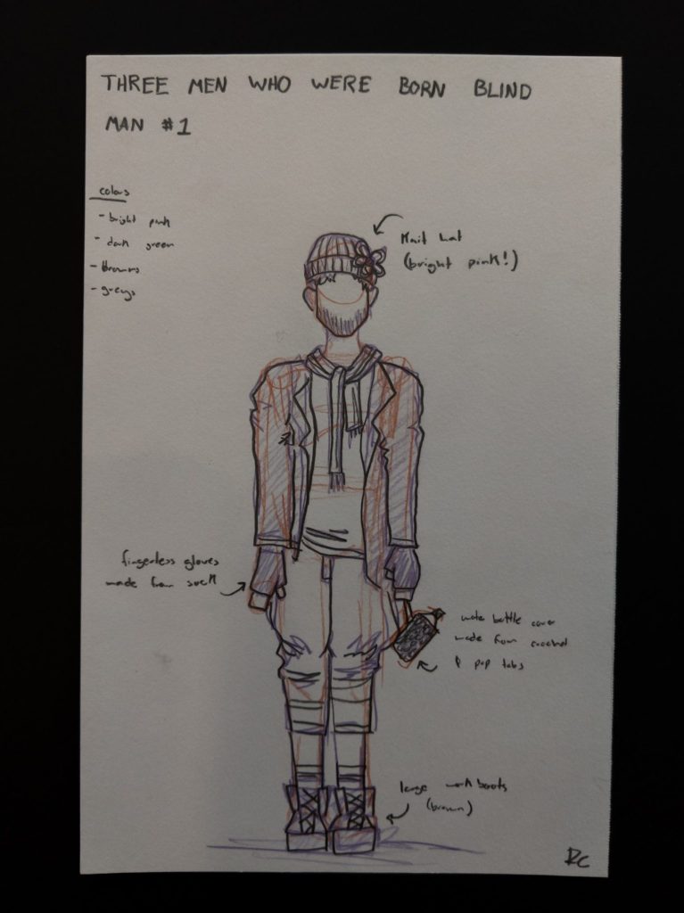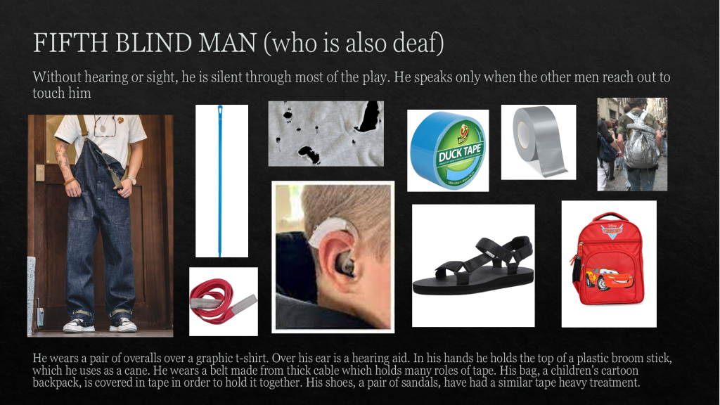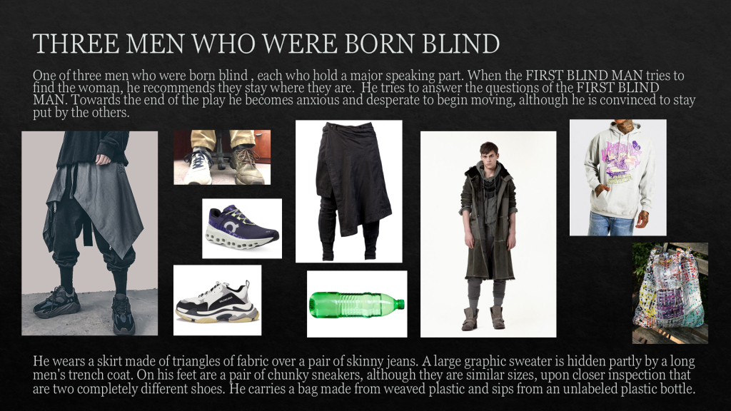 Below is a series of proposed costume designs for Les Aveugles by Maurice Maeterlinck. Les Aveugles tells the story of a group of blind asylum patients who are left abandoned in the woods after the priest who was guiding them suddenly disappears. Inspired by the idea that many of us are ‘blind’ to the current climate crisis, I chose to set my interpretation of the play in a possible future, where society has collapsed due to extreme pollution.
