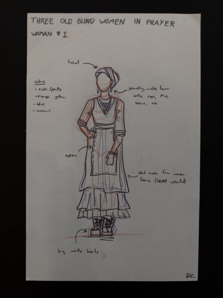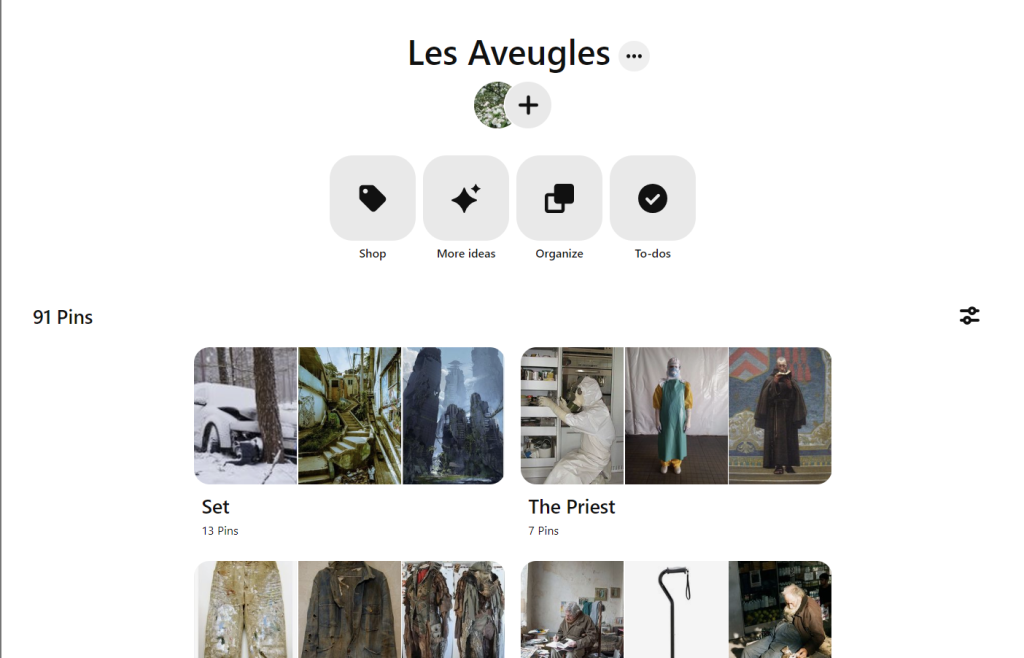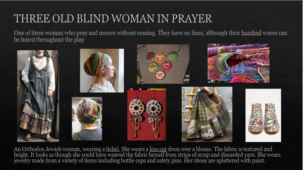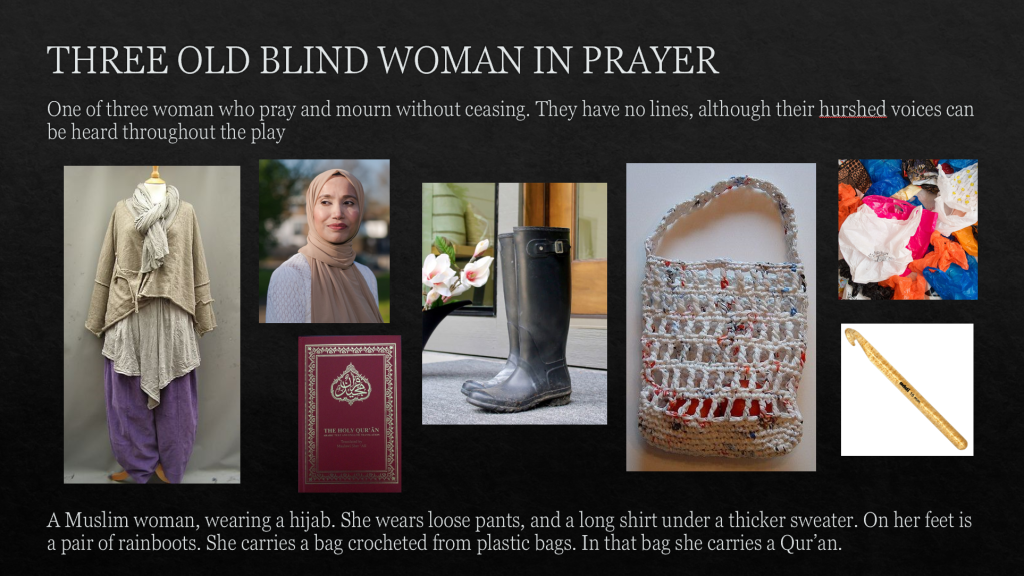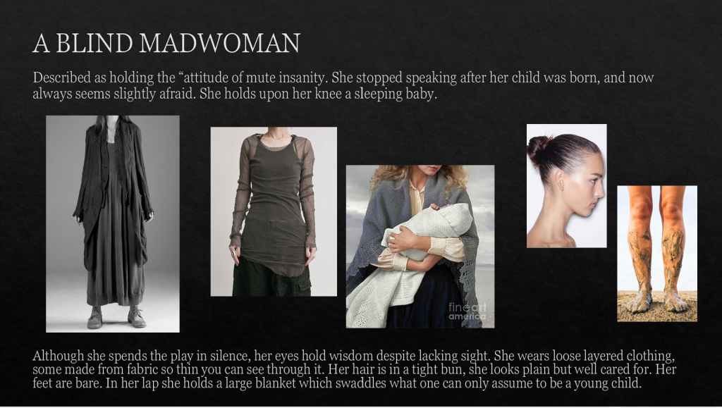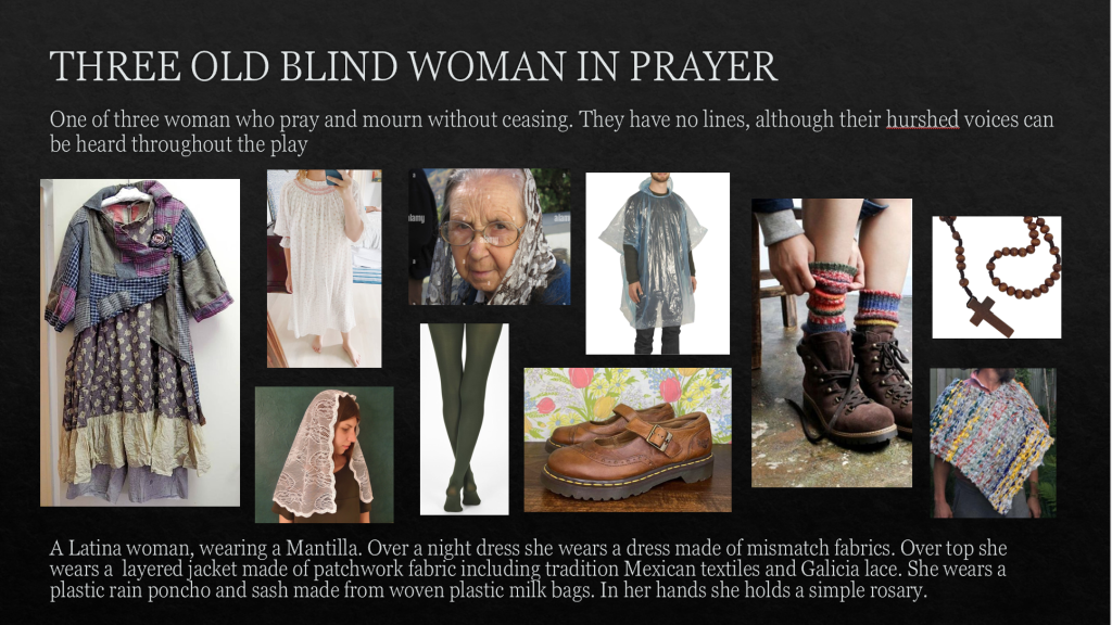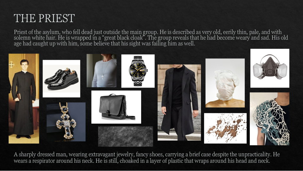 Below is a series of proposed costume designs for Les Aveugles by Maurice Maeterlinck. Les Aveugles tells the story of a group of blind asylum patients who are left abandoned in the woods after the priest who was guiding them suddenly disappears. Inspired by the idea that many of us are ‘blind’ to the current climate crisis, I chose to set my interpretation of the play in a possible future, where society has collapsed due to extreme pollution.
