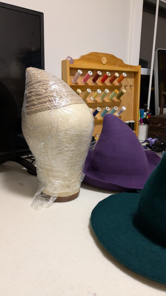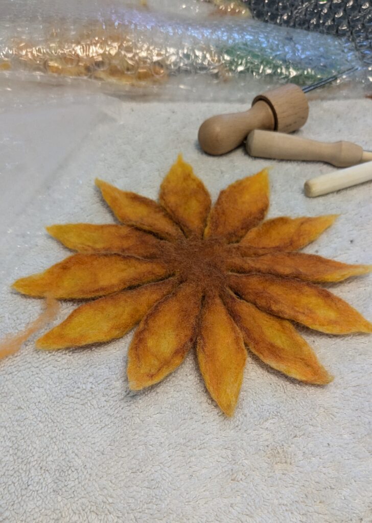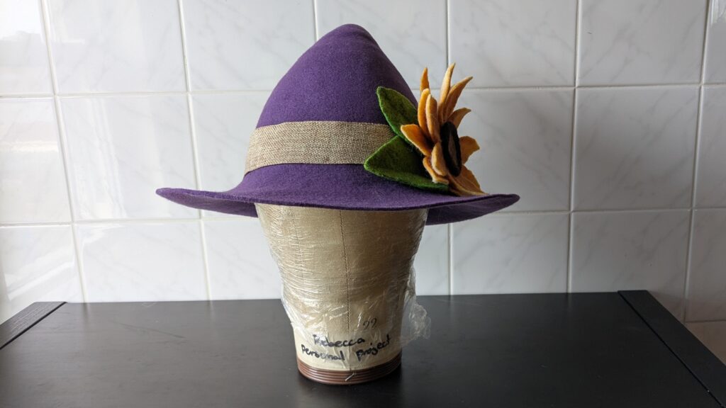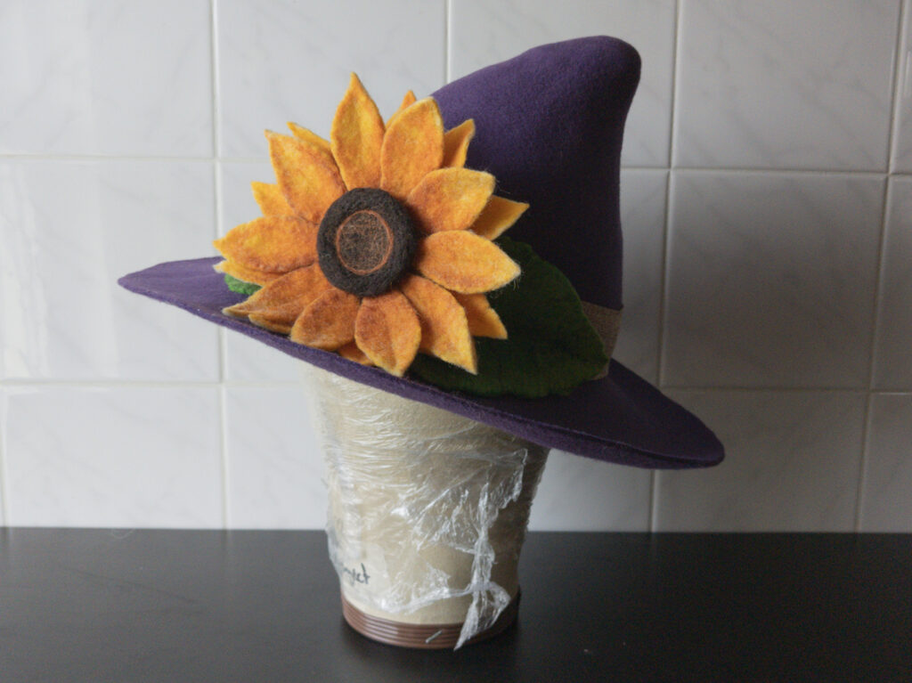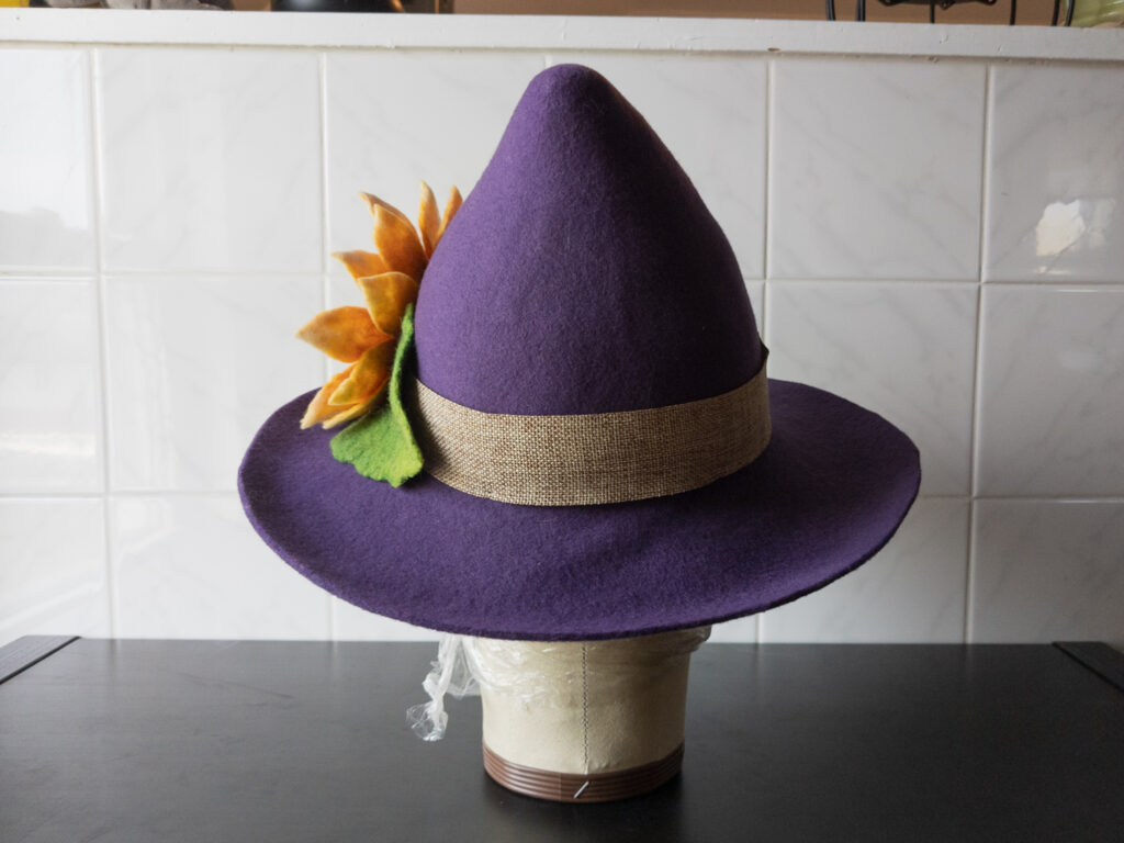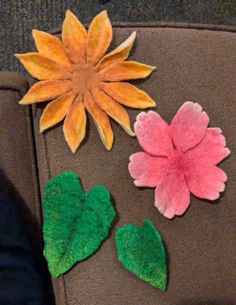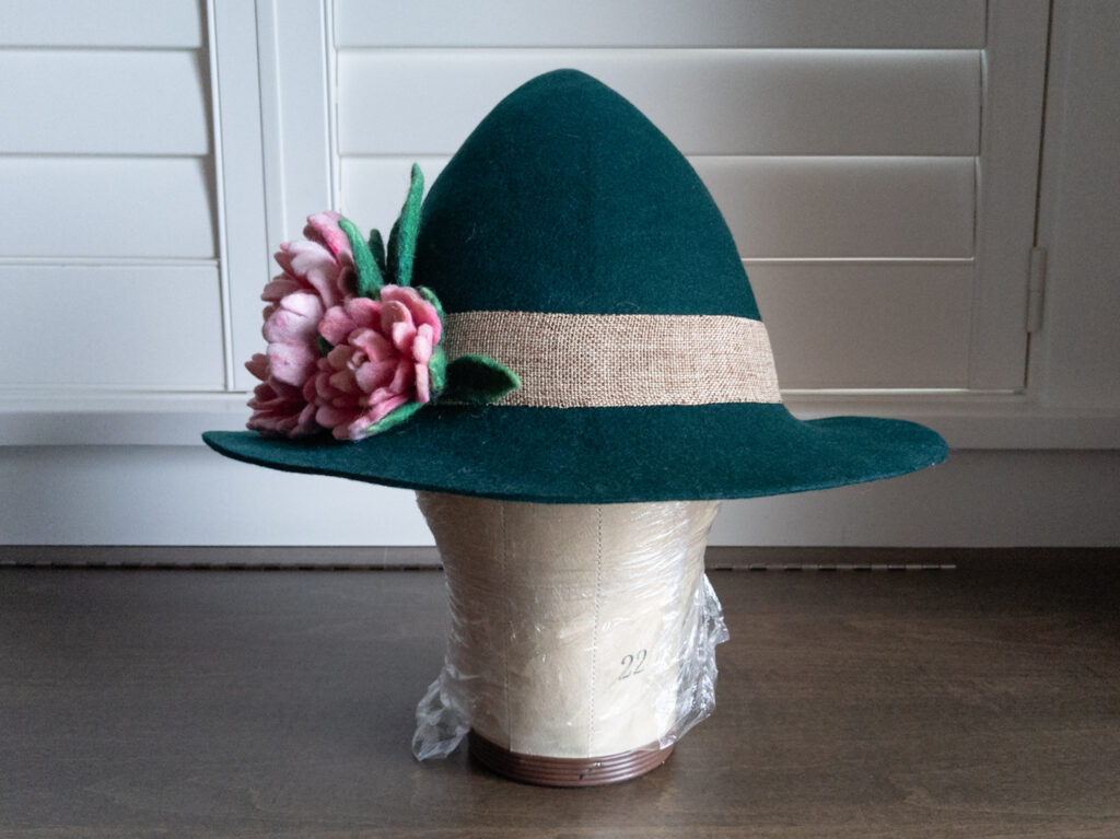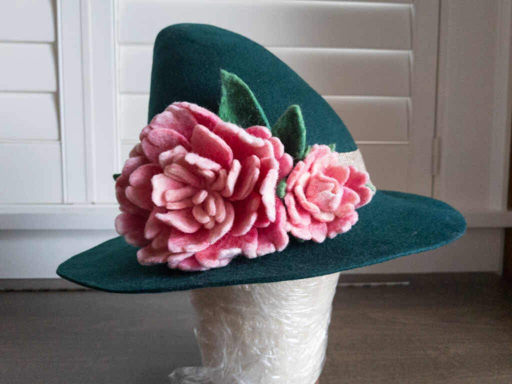 Experimenting with the world of millinery I made a costum hat form and blocked these hats from a felt hood. The florals were made with a combination of wet and needling felting.