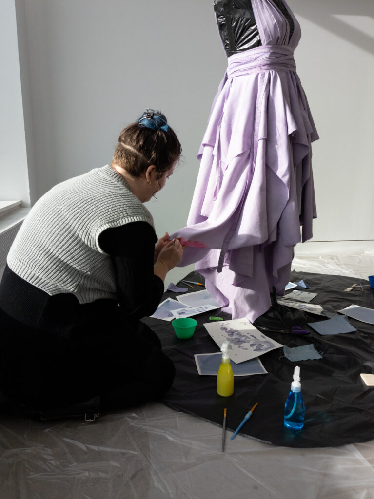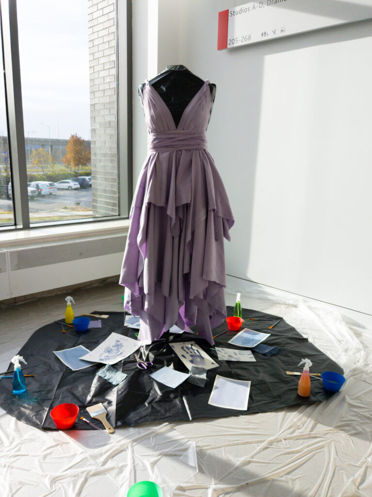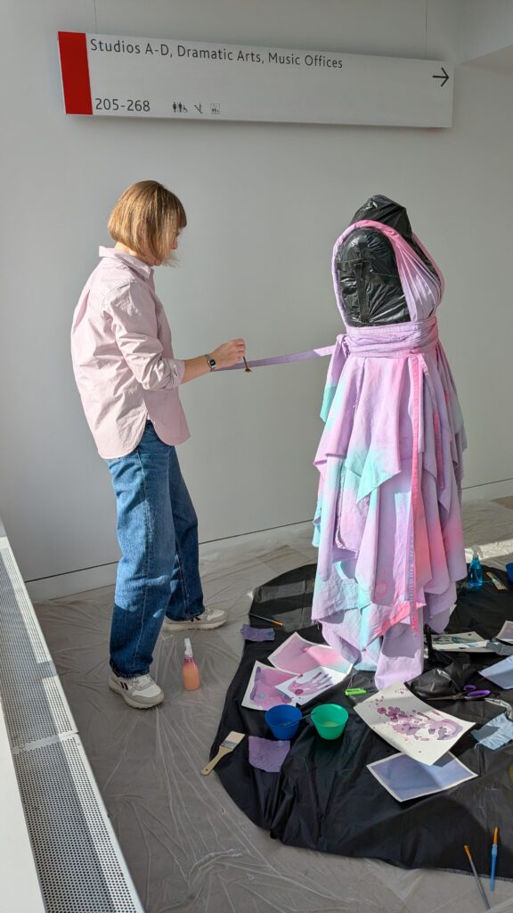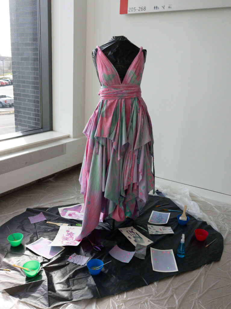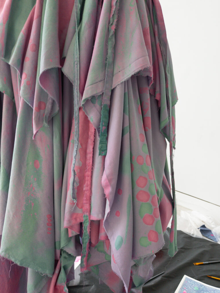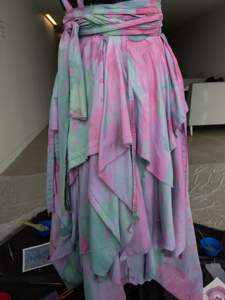 Using pH sensitive eco dye I created this dress to part of a project exploring ways to incorporate audience participation in the creation of costumes. By applying two different solutions participants were able to watch the dress react to their additions in real time.